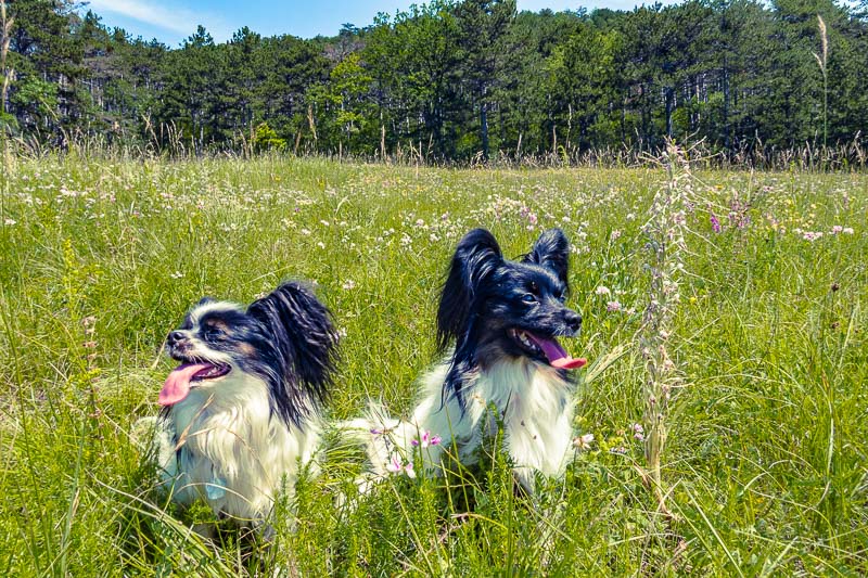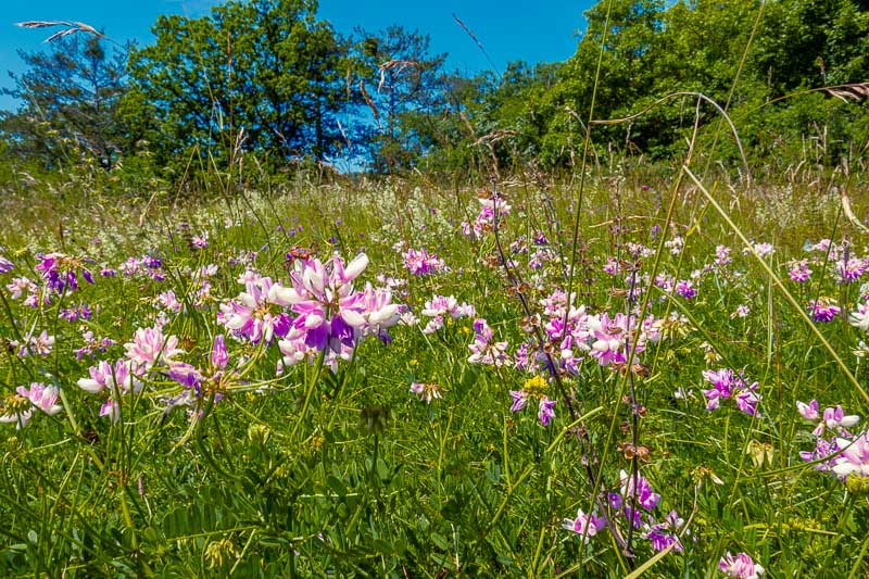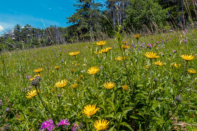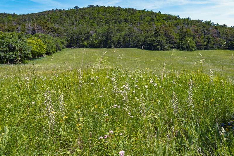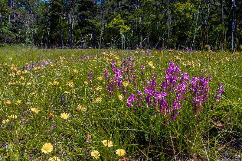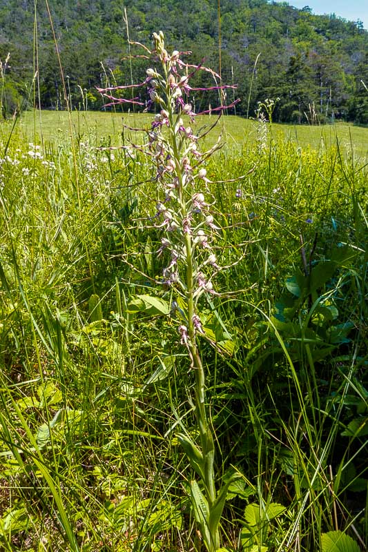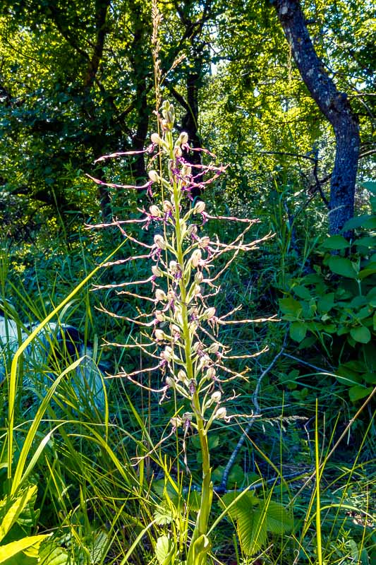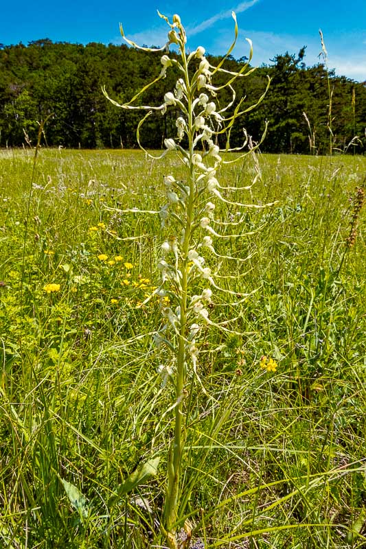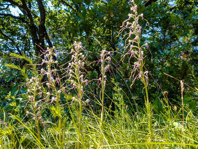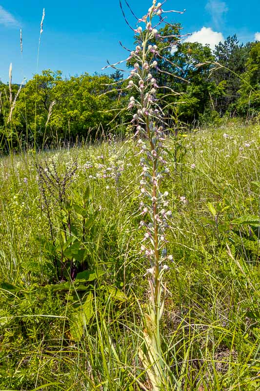 Hinter der Schwertlilienwiese erstreckt sich eine naturbelassene Wiese bis zu Waldrand. Dort blühen heuer mehr als 100 adriatische Riemenzungen (Himantoglossum adriaticum)