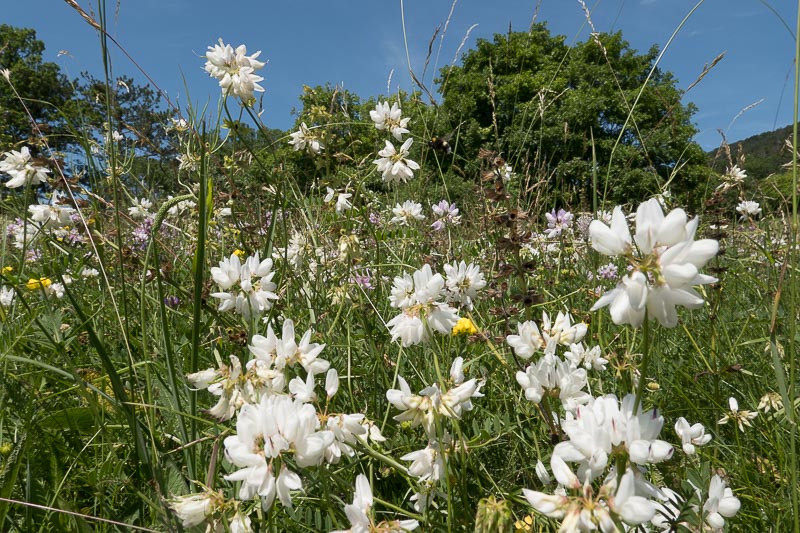 Bunte Kronwicke (Securigera varia) in einer weißen Albinoform.