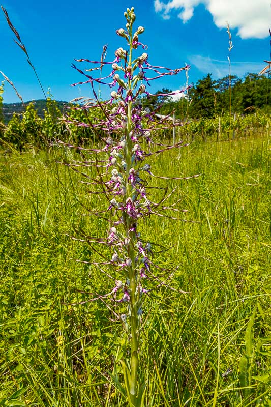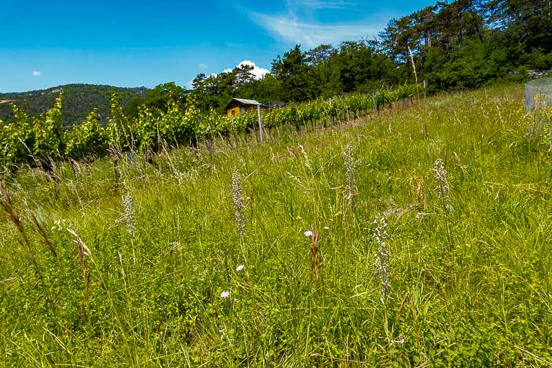 Ich wandere noch eine Wiese zwischen zwei Weingärten hinunter - auch hier finde ich, so wie vor ein paar Jahren, noch einmal adriatische Riemenzungen (Himantoglossum adriaticum).