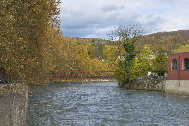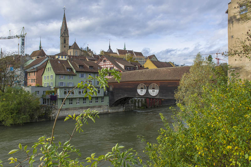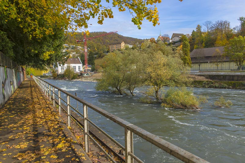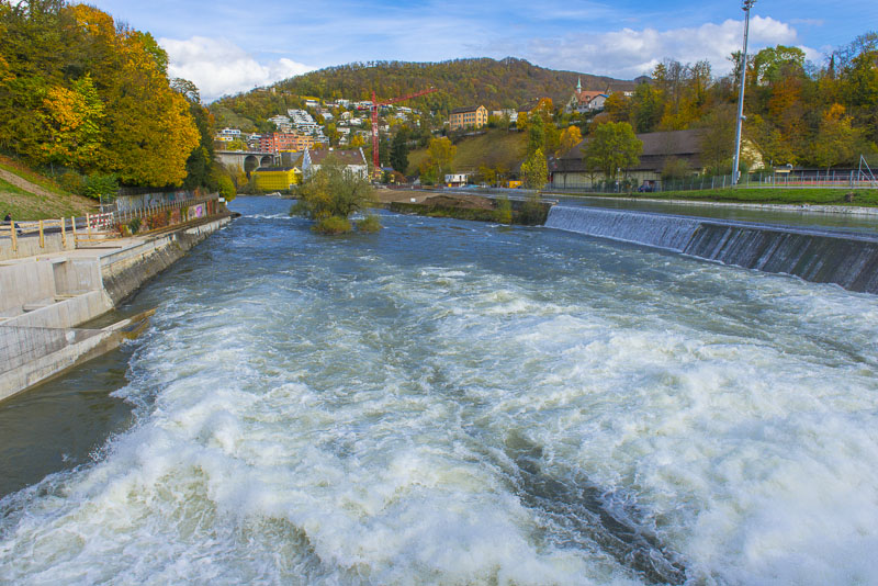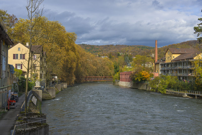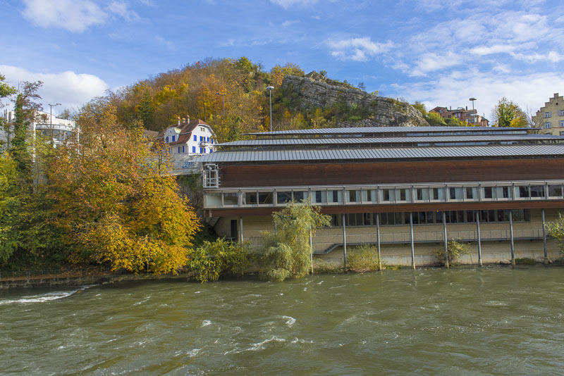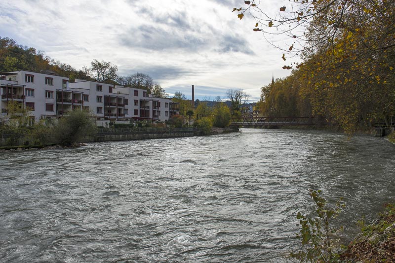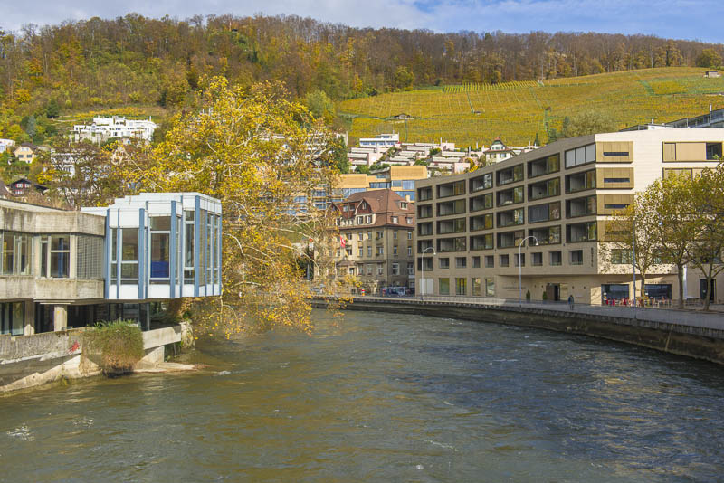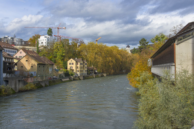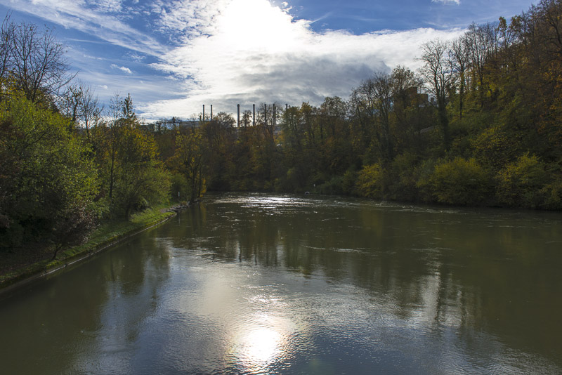 First, I cross the big street near the hotel and walk down to the Limmat river, which is backed up there for a small water power plant.