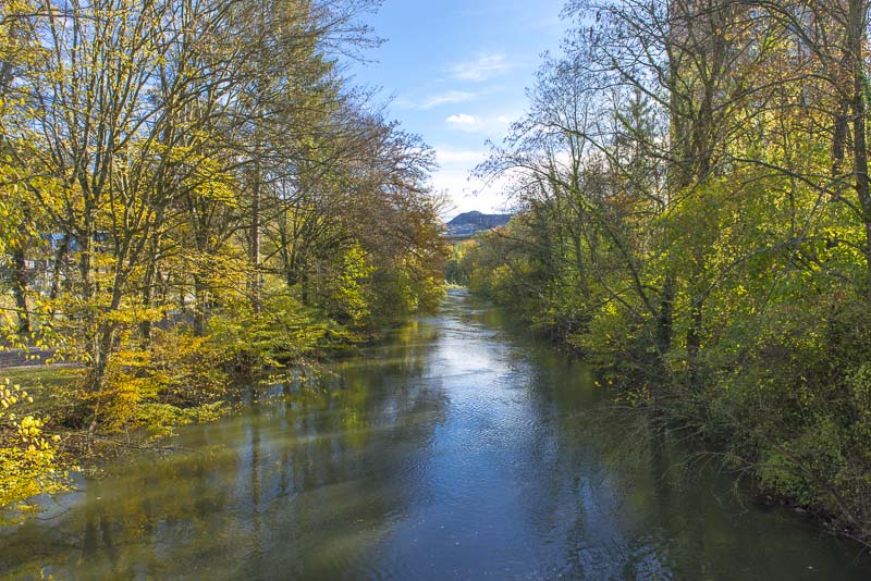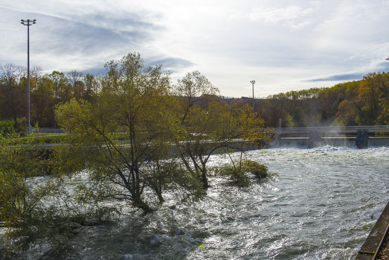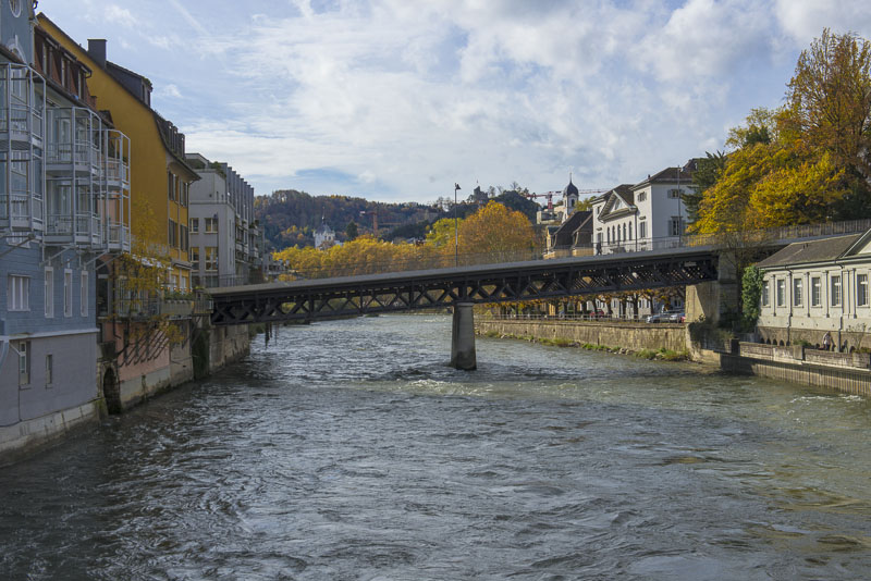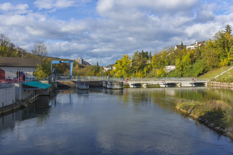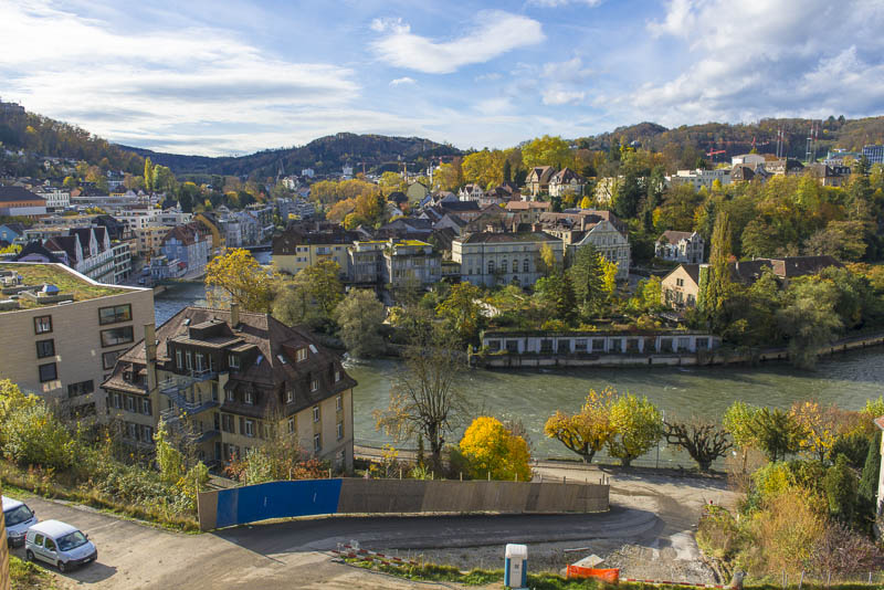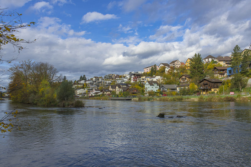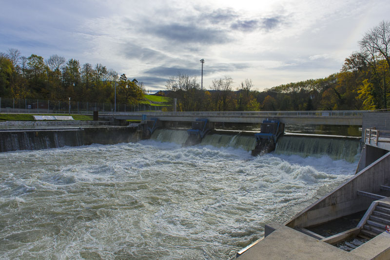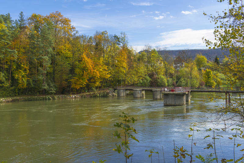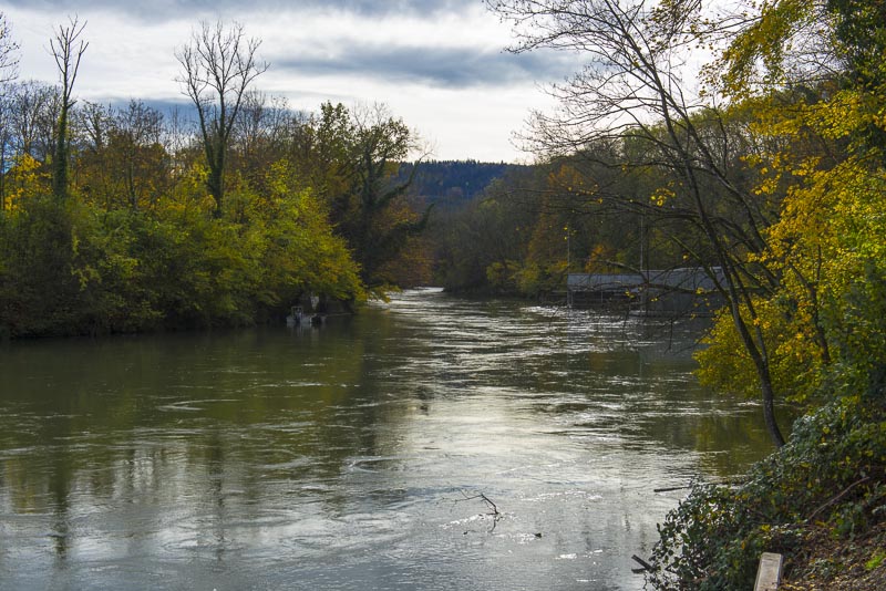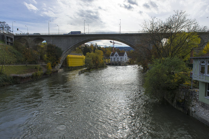 First, I cross the big street near the hotel and walk down to the Limmat river, which is backed up there for a small water power plant.