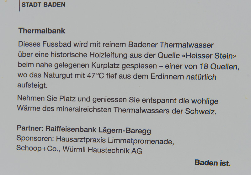 It says: this footbath is filled with pure thermal water led by a historic wooden tube from the fountain "Heißer Stein" ("Hot stone"), where it comes out with 47 °C. Take a seat and relax in Switzerland´s most mineral rich thermal water.