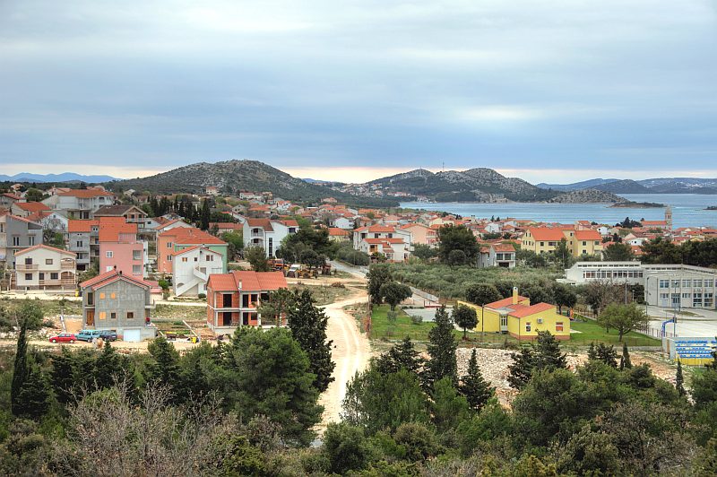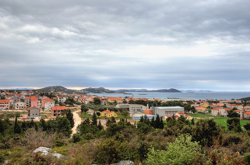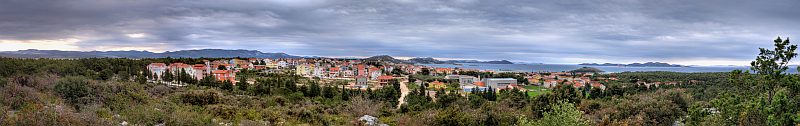 Panoramic picture of Pakoštane, the sea to the right, and a glimps of Vransko Jezero to the right. Click here or into the picture for a larger version.