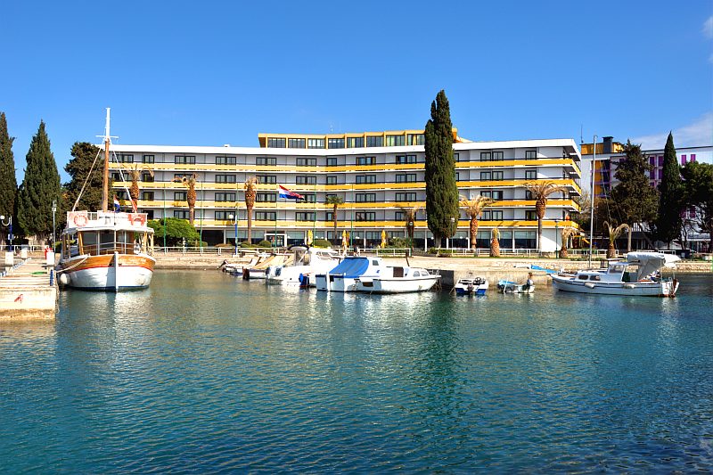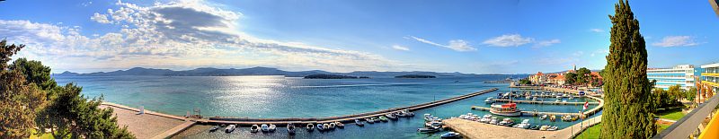 Panoramic view from our balcony, most of the view is the island of Pašman, far right the old town of Biograd. Click here or into the picture for a larger version.