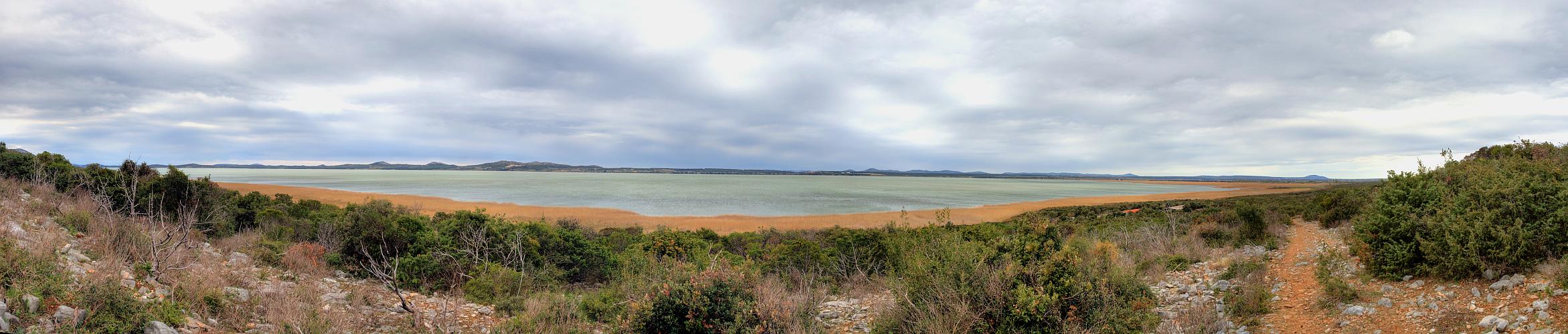 Panoramabild des Vransko Jezero mit Blick nach Westen. Hinter dem sanften Höhenrücken im Hintergrund ist nach etwa einem Kilometer bereits das Meer, rechts dahinter auch schon die Insel Pašman sichtbar.