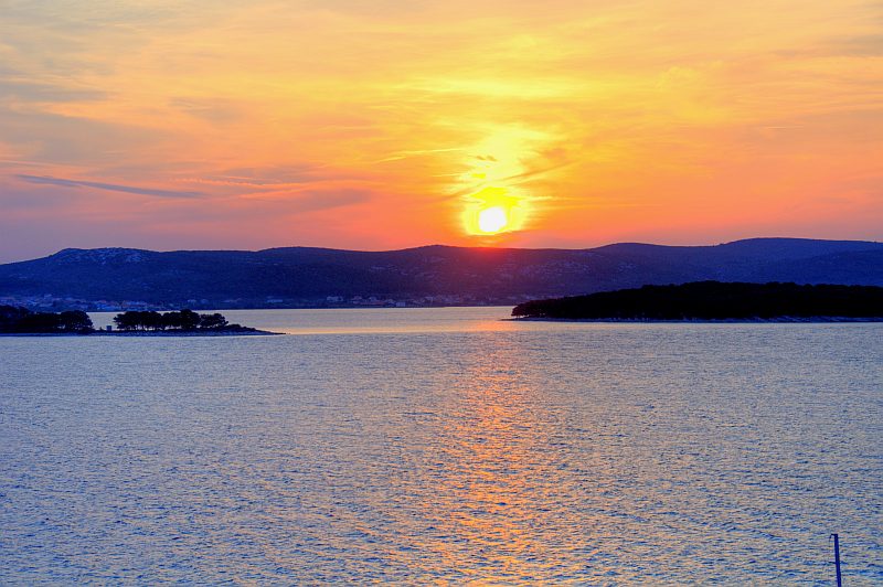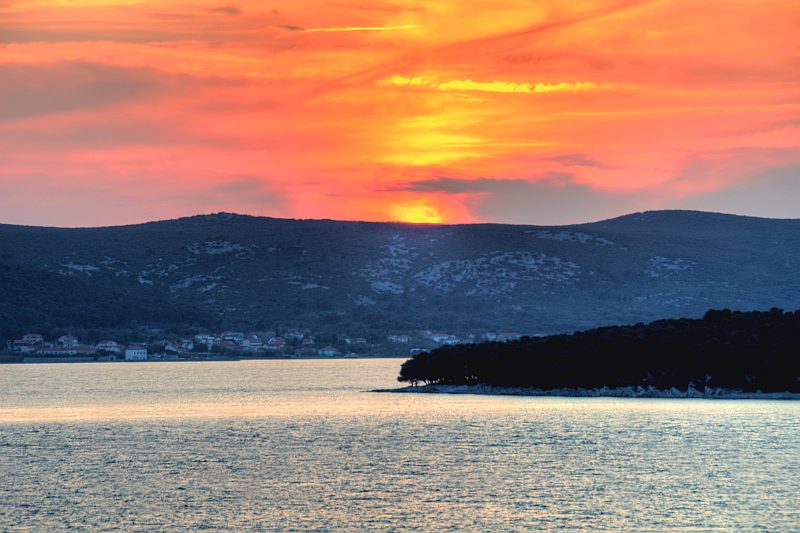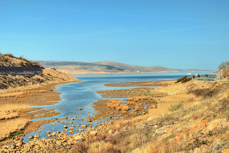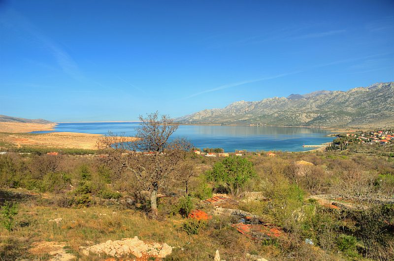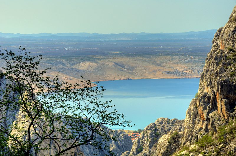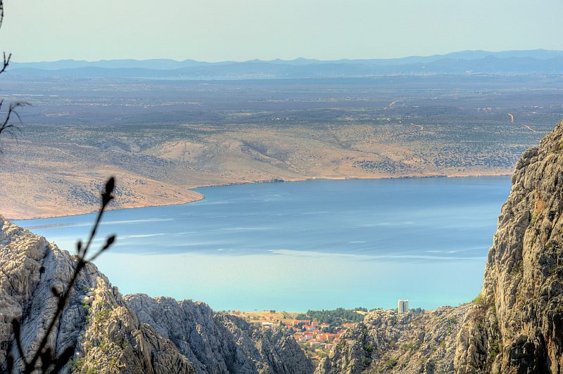 Vierw from the highway exit Maslenica over the so called Velebitski Canal, a long, narrow strait between the continent with the Velebit mountains and the peninsula of Pag (to the left). To the right is the Velebit.