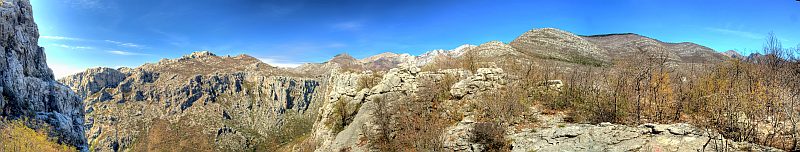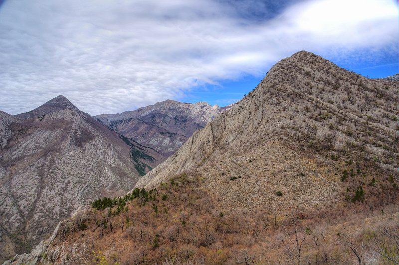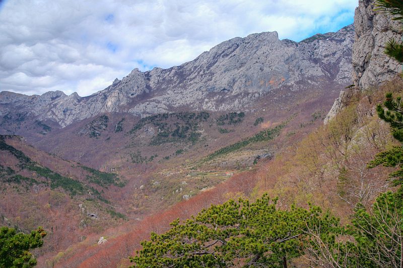 Arrived at the saddle. Panoramic view over the Velika Paklenica gorge, to the right in the background is the main ridge, the highest summit of the Velebit, Vaganski Vrh (1.758 m) is peering out behind Borovnik (1.056 m). Click here or into the picture for a larger version.