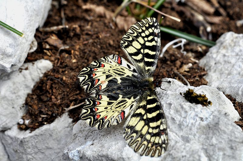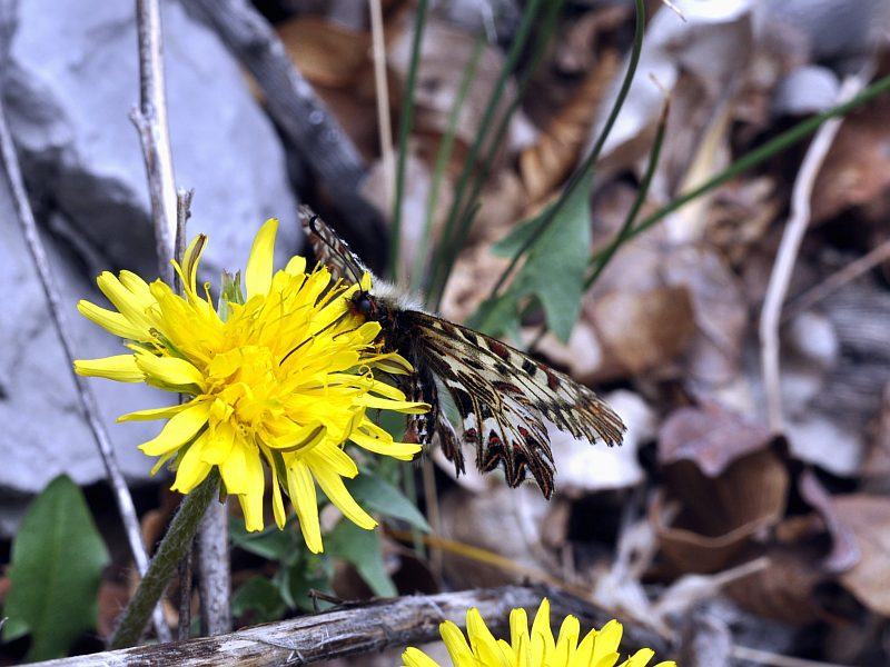 A grey dandelion with a visitor: Southern Festoon (Zerinthia polyxena)