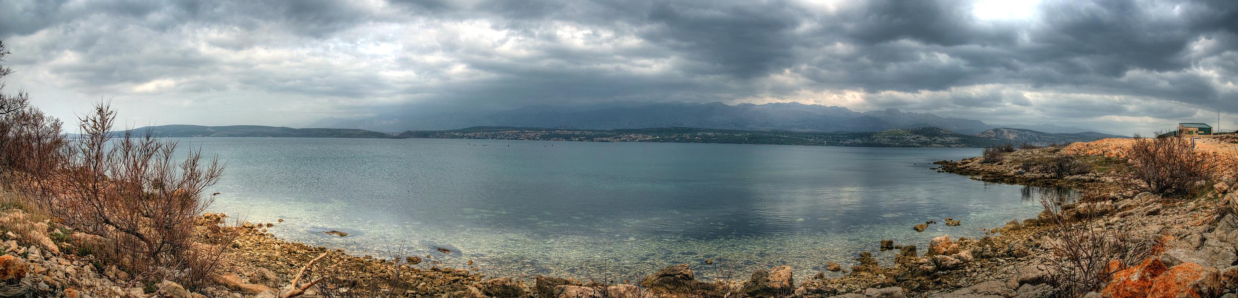 Panorama des Novigradsko More von unweit Novigrad. Im Hintergrund - teilweise von Wolken verhüllt - Das Velebit - Gebirge. Links sieht man vor den Bergen die Autobahnbrücke über den schmalen Kanal, der das Novigradsko More mit dem offenen Meer des Velebit - Kanals verbindet.