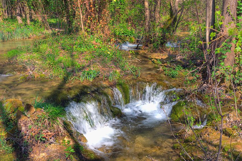 We start at the upper end of the waterfalls. The water is flowing thrugh an alluvial forest, parted into numerous branches. So, we first only see many small and tiny cascades ...