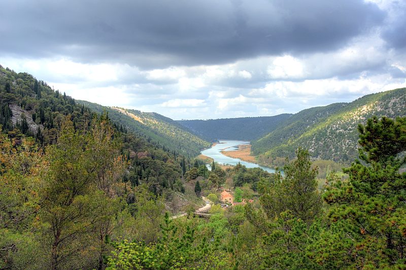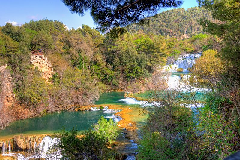 A fine view from a view point to the main falls of Skradinski Buk, situated at the orographig left side of the dale. Click here or into the picture for a larger version.