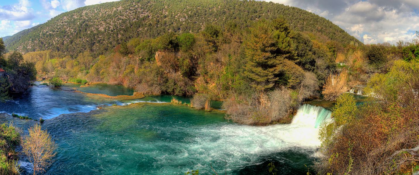 Panoramic view of the upper part of the main falls of Skradinski Buk, Krka falls..