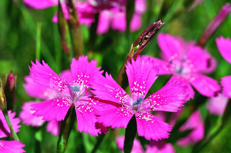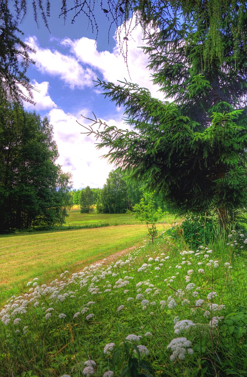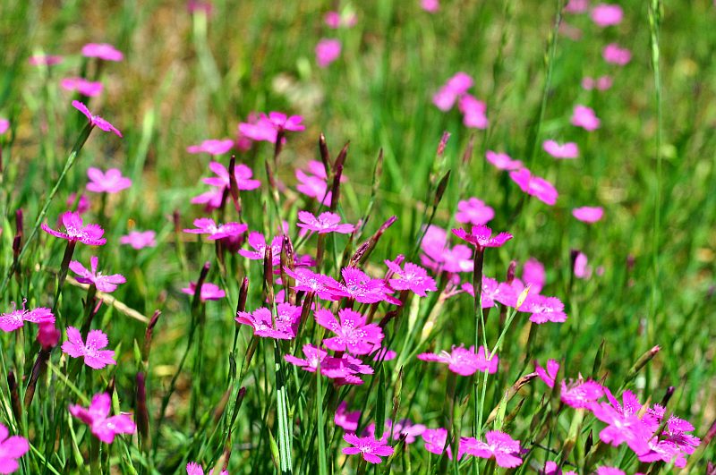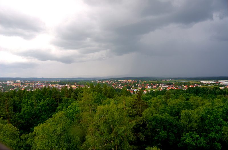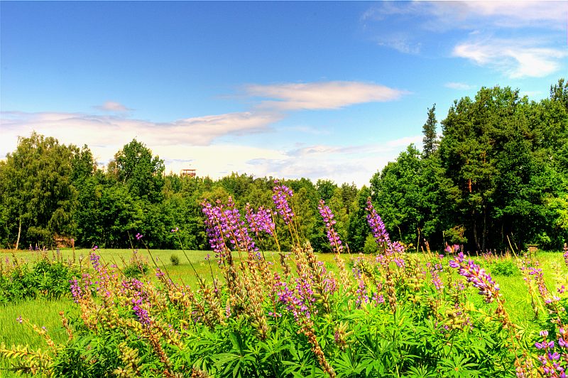 Wiesen, nur mehr wenige Felder. Hier blühen Lupinen; im Hintergrund der Aussichtsturm.