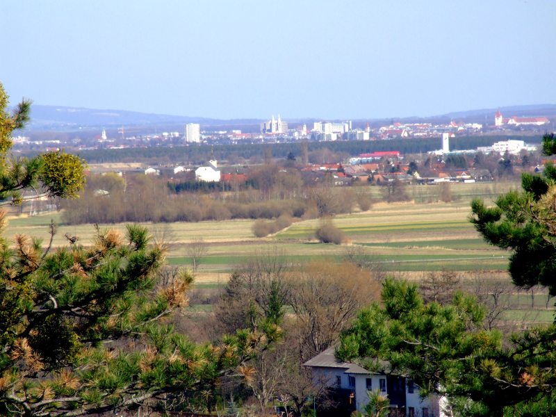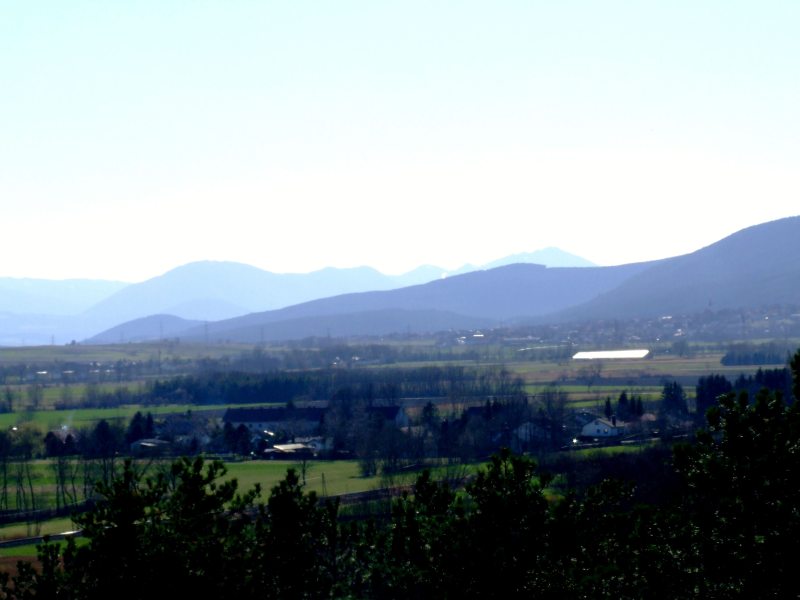 Bei der heutigen sehr klaren Sicht zeigt der Blick nach Wiener Neustadt ungewohnt viele Details: ganz rechts der Wasserturm und die Militärakademie, hinter den beiden Türmen des Domes das Krankenhaus.