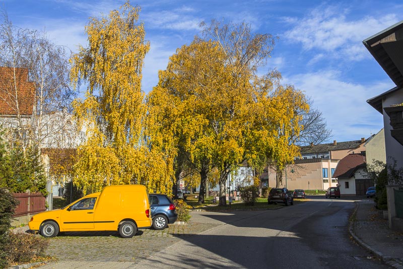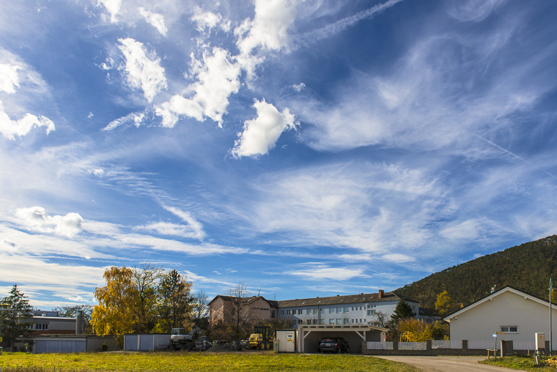 Today it is extremely warm, regarding the season. When we start shortly before noon for a walk through Winzendorf to Blosser Berg, the temperaturee is up to 23°C! Thin fleecy clouds in the sky, and e gusty southern wind.