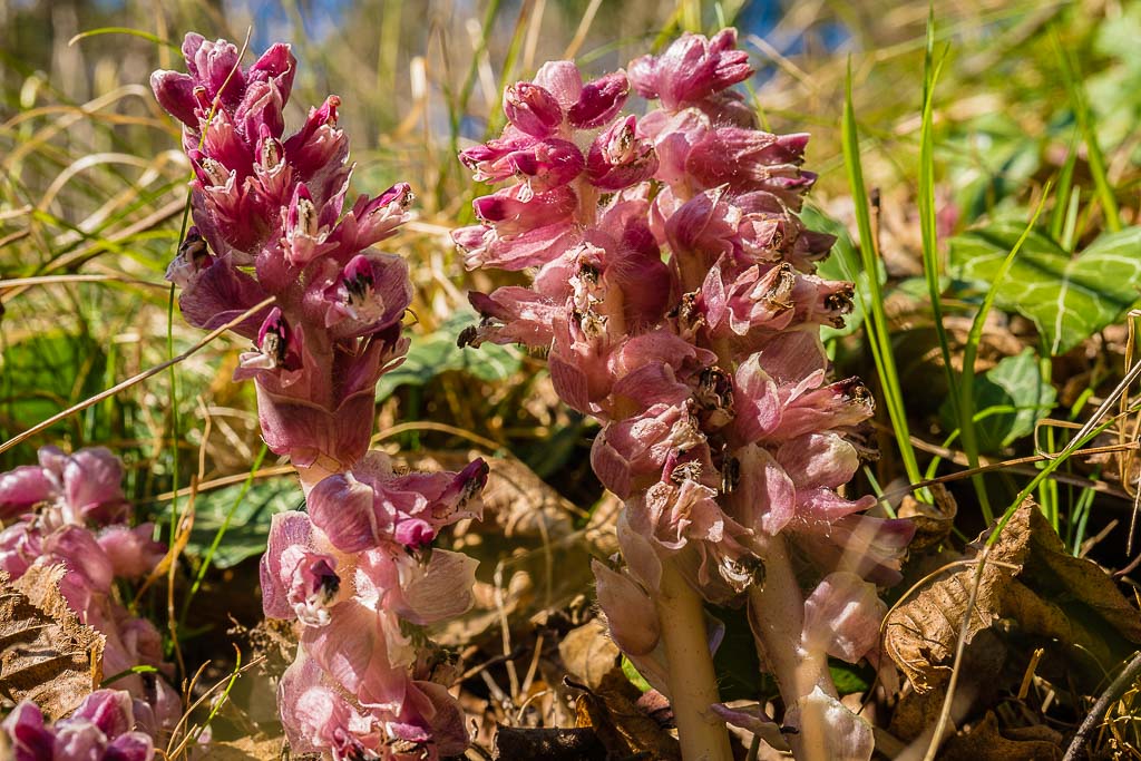 Im Wald finde ich auch erstmals eine ganze Gruppe mit Schuppenwurz (Lathraea squamaria), um den Stamm einer Schwarzföhre.