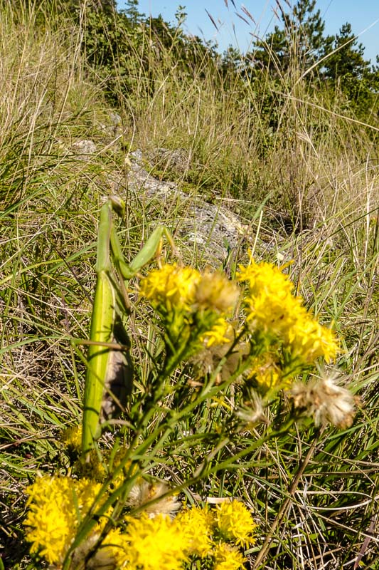 This partly withered plant has a visitor, waiting for prey to come - a European mantis (Mantis religiosa)