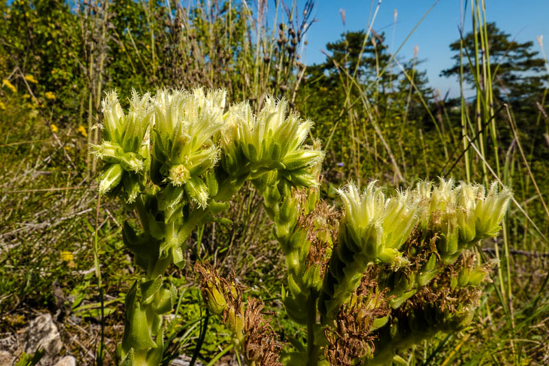 Many flowrishing exemplars of the "beard of Jupiter" (Sempervivum globiferum subsp. hirtum)
