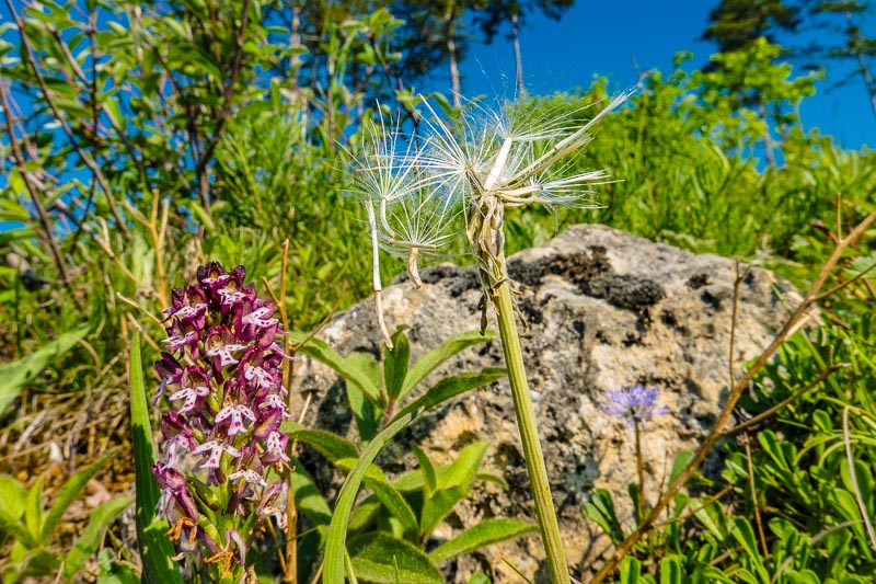 Burnt orchid (Neotinea ustulata) and fruits of the Austrian Black salsify (Scorzonera austriaca)