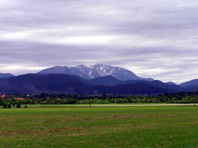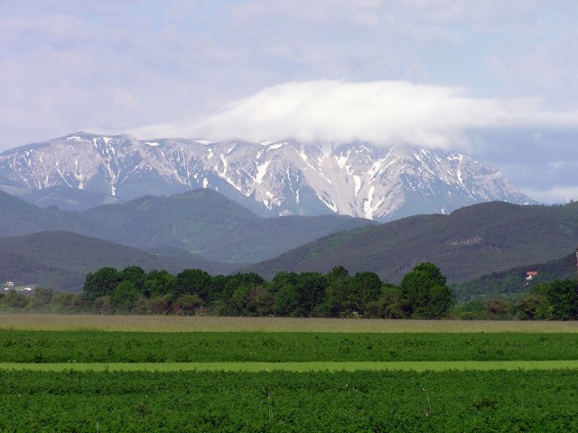 At noon: Schneeberg is free now, but it is cloudy. Being a bit dry and windy, the flowering dark pine forest spreads pollen in big clouds into the air.