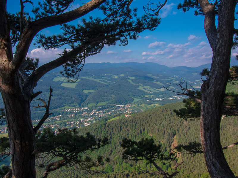 Blick vom Kamm hinunter ins Schwarzatal. Im Hintergrund die Wechselregion.