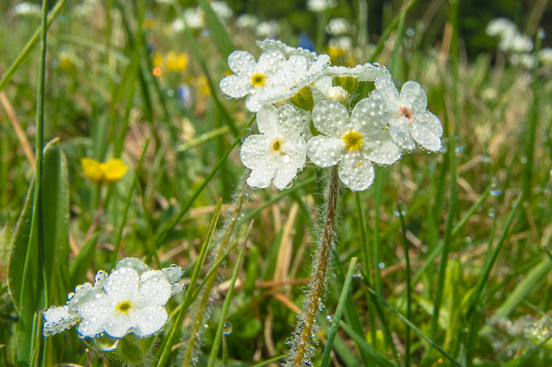 Im Schatten hängen noch die Tautropfen auf diesem Wimper - Mannsschild (Androsace chamaejasme).