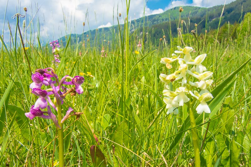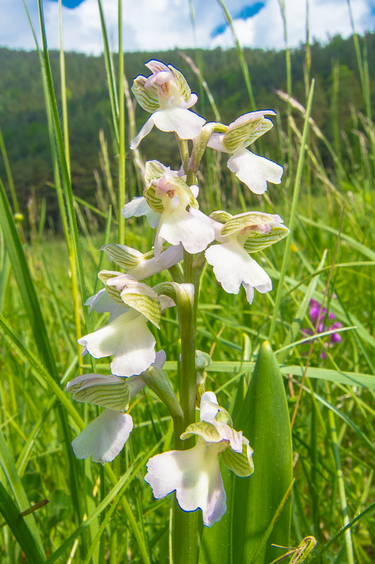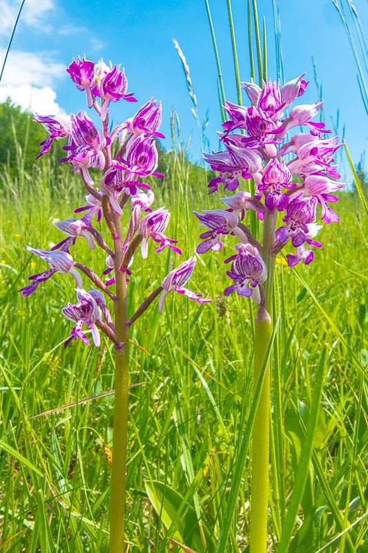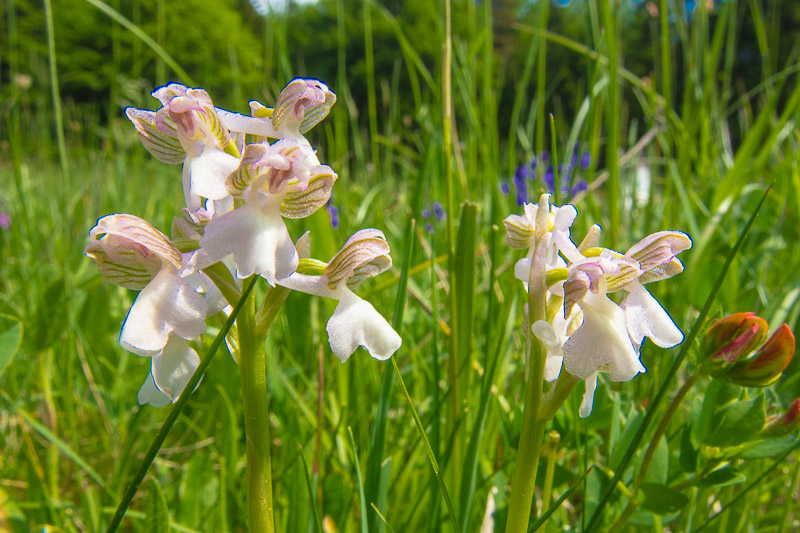 Helmknabenkraut (Orchis militaris), dazwischen ein fast schon verblühtes Kleines Knabenkraut.