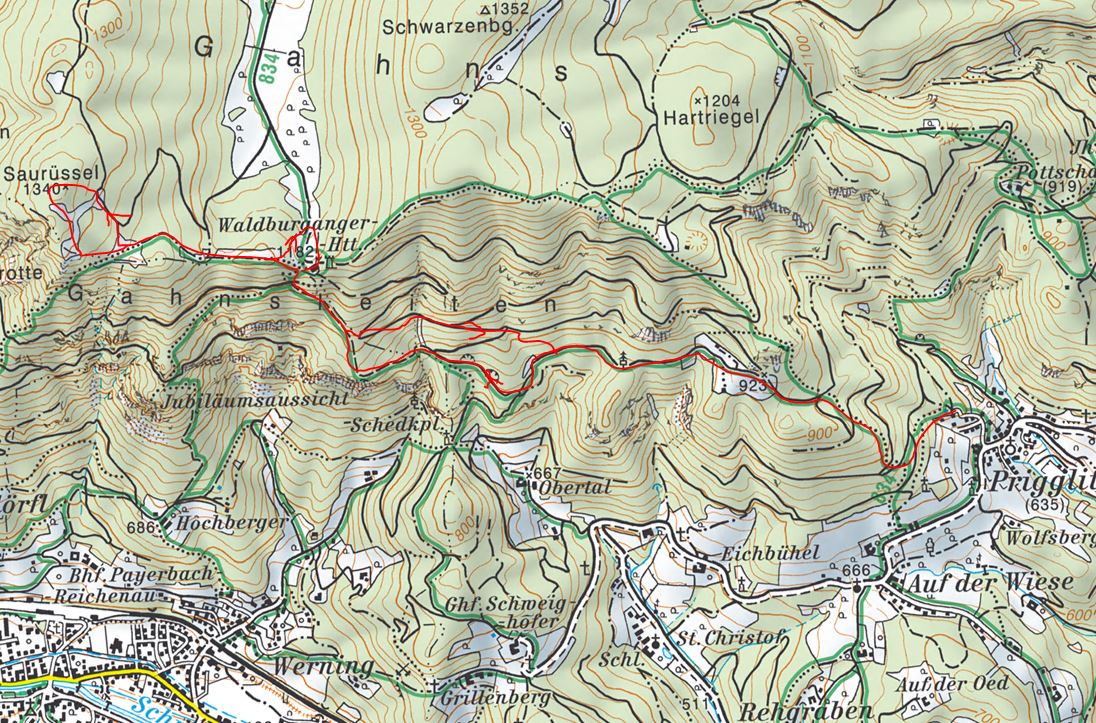 Heute ist Muttertag, und da wird traditionellerweise zu Mittag gegrillt. Eine größere Tour geht daher nur mit einem sehr frühen Aufbruch. Ist auch insofern gut, als "ab dem späten Vormittag" Gewitter angesagt sind. Ich gehe daher bereits um 6:50 von Prigglitz weg.