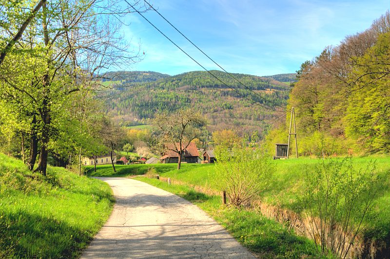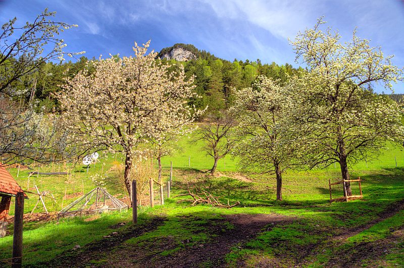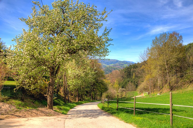 Blühende Bäume beim Hochberger. Leider verläuft der hier in der Karte eingezeichnete Weg nach und nach im Nichts, sodass ich mich einige hundert Meter durch den Wald zur Straße durchschlagen muss.