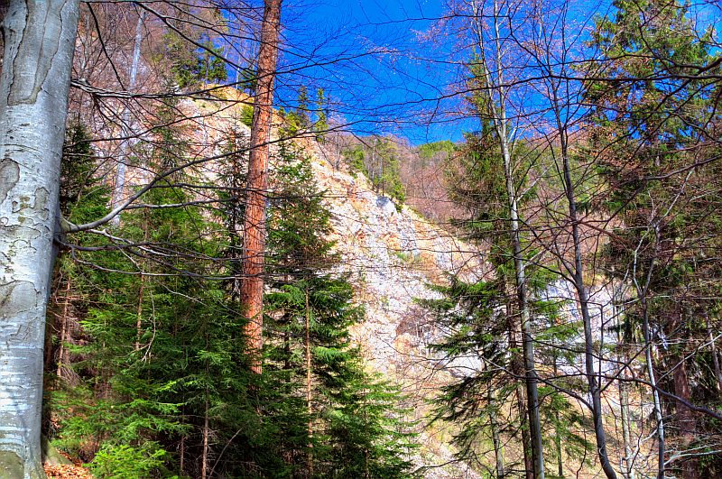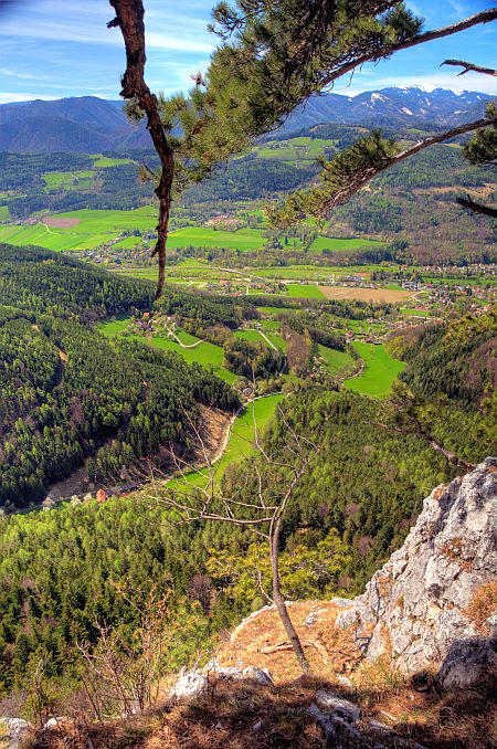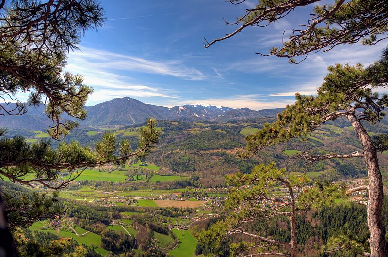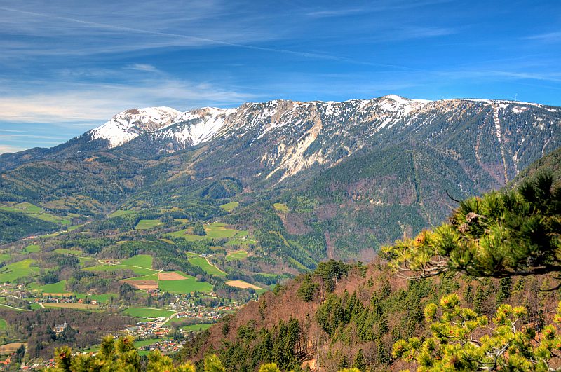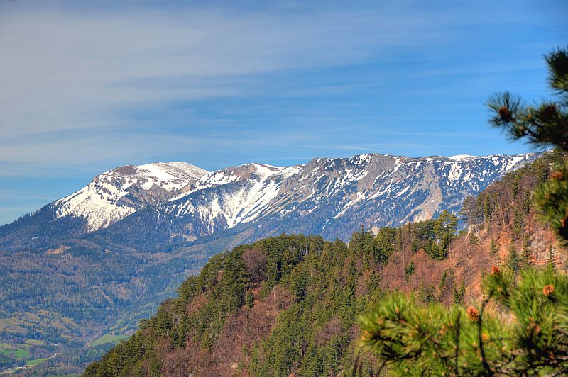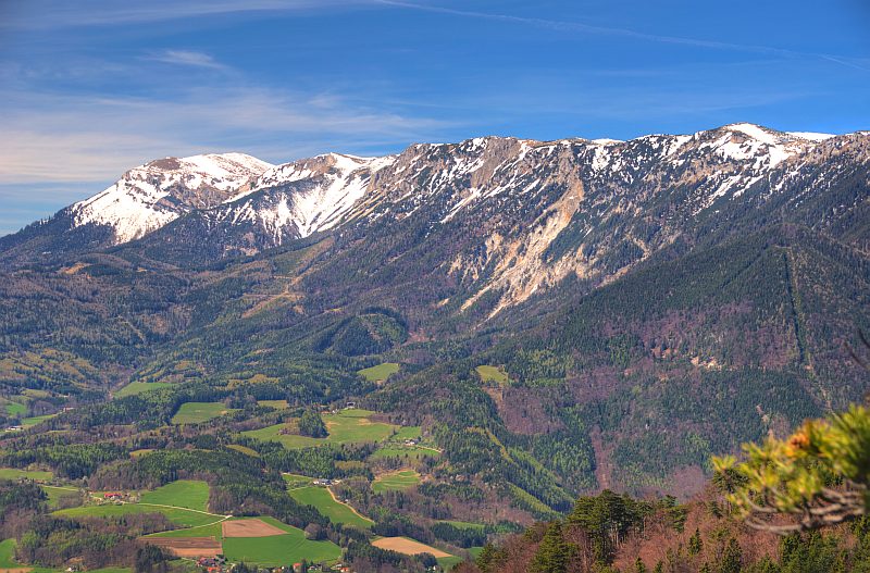 Da ich nicht die Zeit habe, die Bodenwiese entlang zu wandern, steige ich wieder ab, diesmal auf einer etwas anderen Route. Von der Jubiläumsaussicht geht der Blick zur Rax.