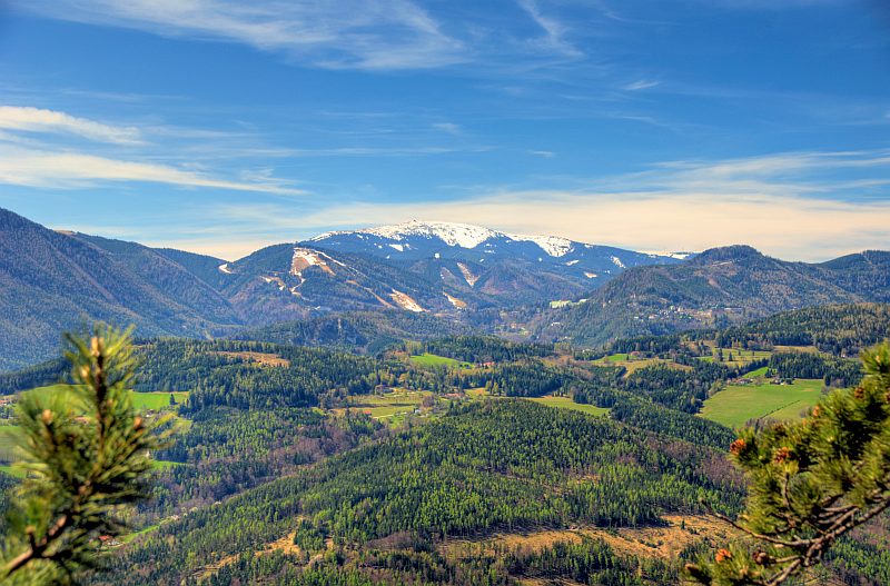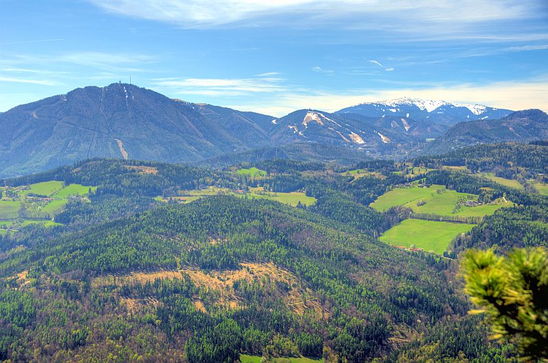 Im Zoom: Sonnwendstein mit der ORF Sendeanlage, Hirschenkogel mit seinen Schipisten und Stuhleck.
