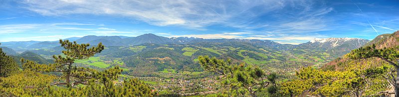 180 Grad Panoramablick nach Süden von der Jubiläumsaussicht. Ganz links im Hintergrund das Wechselmassiv, dann Sonnwendstein, Hirschenkogel und Stuhleck, die Berge nördlich der Semmeringregion und ganz rechts die Rax. Unten im Tal links Payerbach, rechts Hirschwang und Edlitz. Hierher oder ins Bild klicken für eine größere Darstellung.