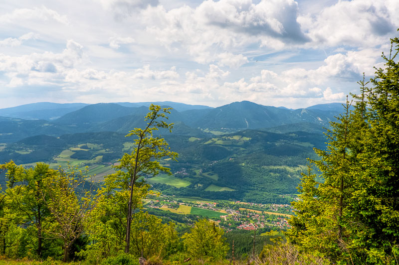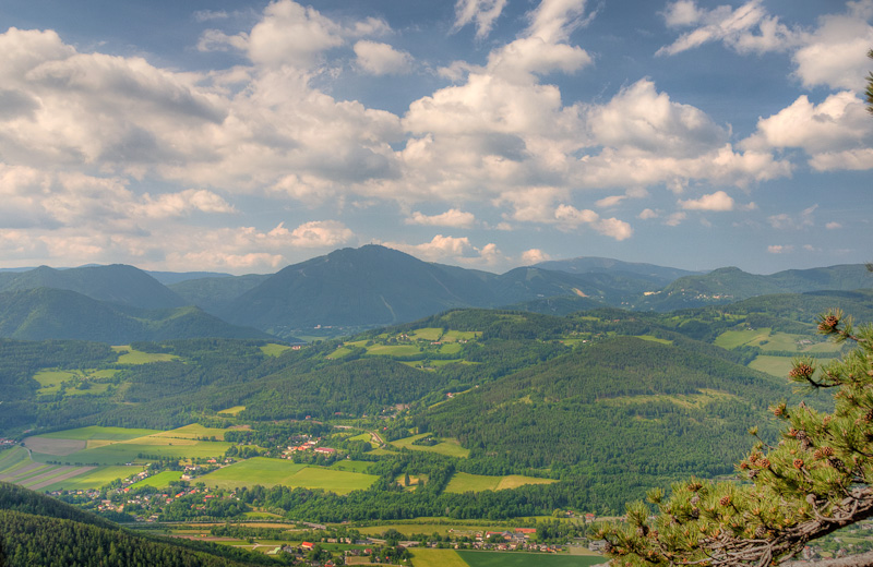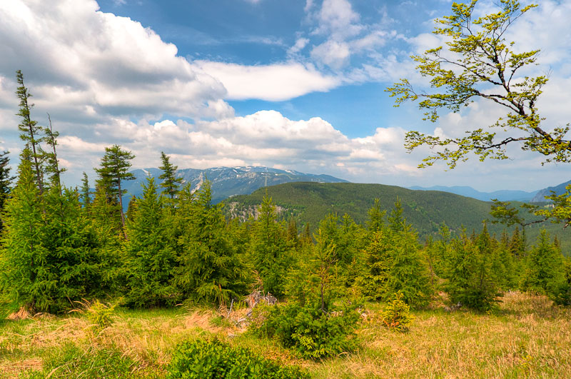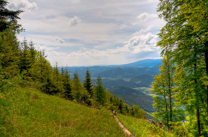 Blick von unterwegs zum Sonnwendstein, rechts davon der Hirschenkogel und dahinter das Stuhleck.