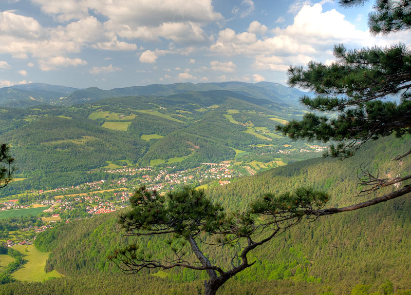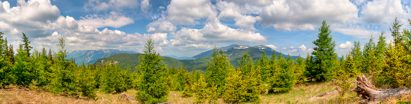 Panoramablick vom Saurüssel zur Rax und zum Schneeberg. Hierher oder ins Bild klicken für eine größere Darstellung.