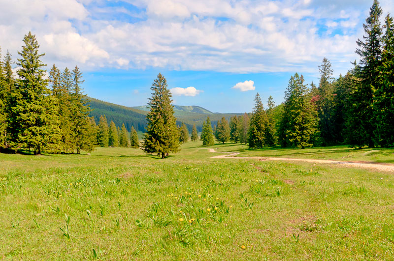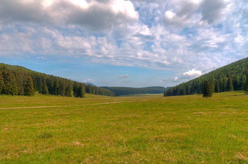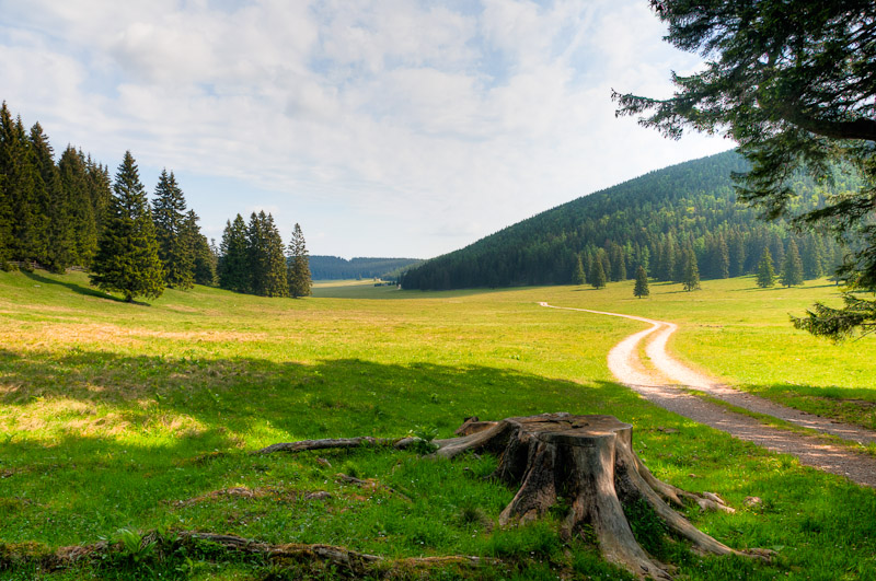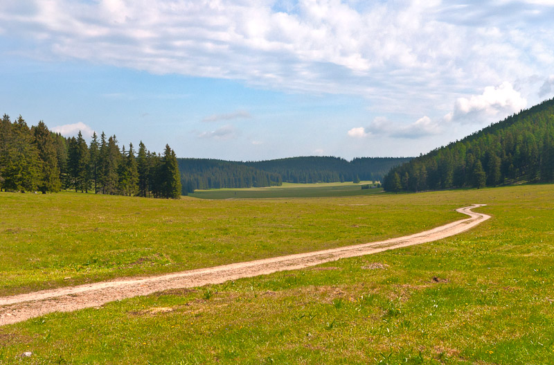 Die riesige Wiesenfläche überzieht eine Senke auf dem Plateau des Gahns - Massivs.