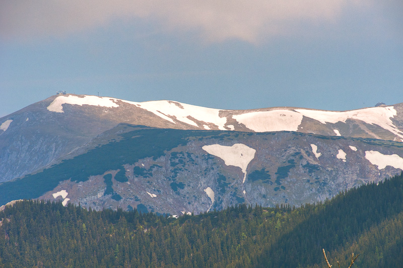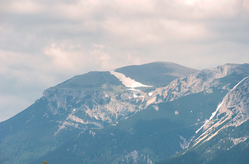 Die Heukuppe, mit 2.009 m die höchste Erhebung auf der Rax. Das auffällige Schneefeld heißt Schneeloch, hier hält sich meist das ganze Jahr der Schnee.