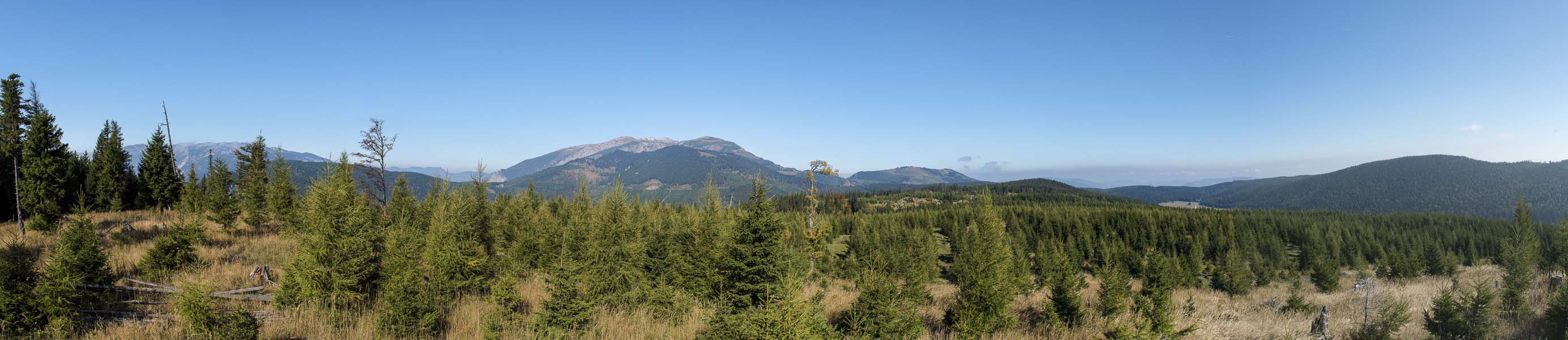 Panoramic view from the summit of Saurüssel (1.340 m): Rax, Höllental, Schneeberg (with Krumbachstein projecting in from of it), Hoher Hengst, Bodenwiese, Schwarzenberg (1.352 m).