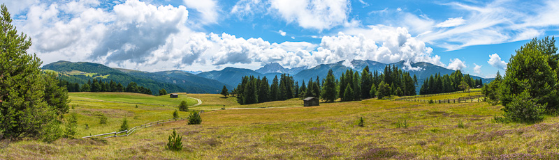 Panoramic picture of the Lüsner Alm viewing to Plose/Telegraph, Peitlerkofel to the left. The Geisler peaks are not visible, we are not high enough. Click here or into the picture for a larger display.
