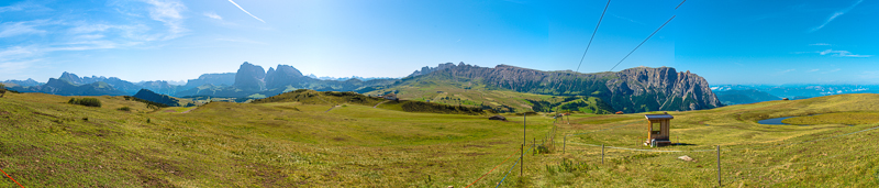 270 degree panorama of the Seiser Alm, from above the summit station of the "Panorama" chairlift. Geisler group, Sella, Langkofel, with Marmolada behind to its right, Rosszahn and Schlern. Click here or into the picture for a larger display.