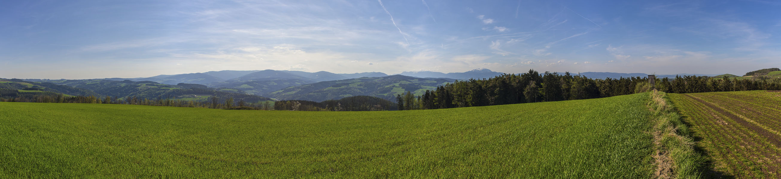 Panoramablick aus der Buckligen Welt (zwischen Edlitz und Lichtenegg) Richtung Hochwechsel, Semmering, Rax, Schneeberg, Hohe Wand.