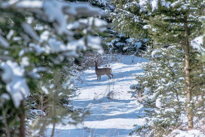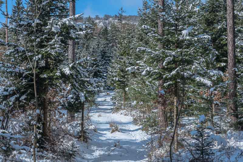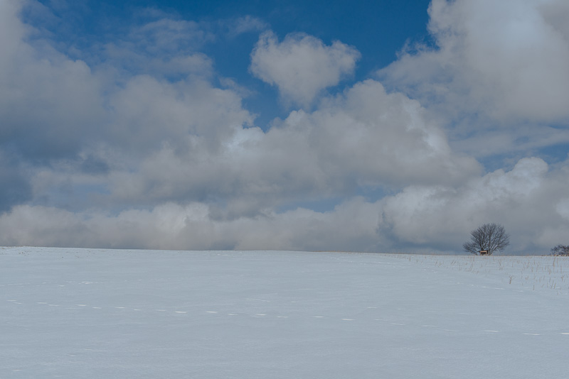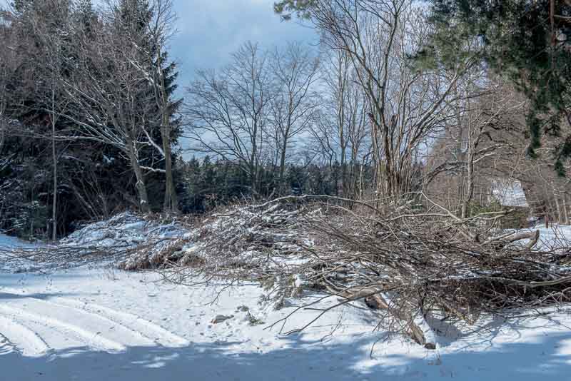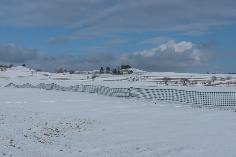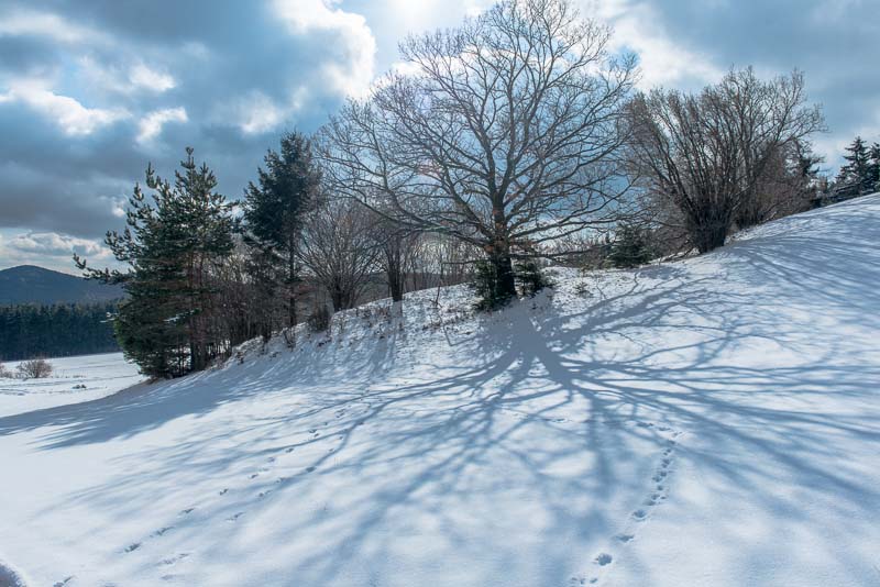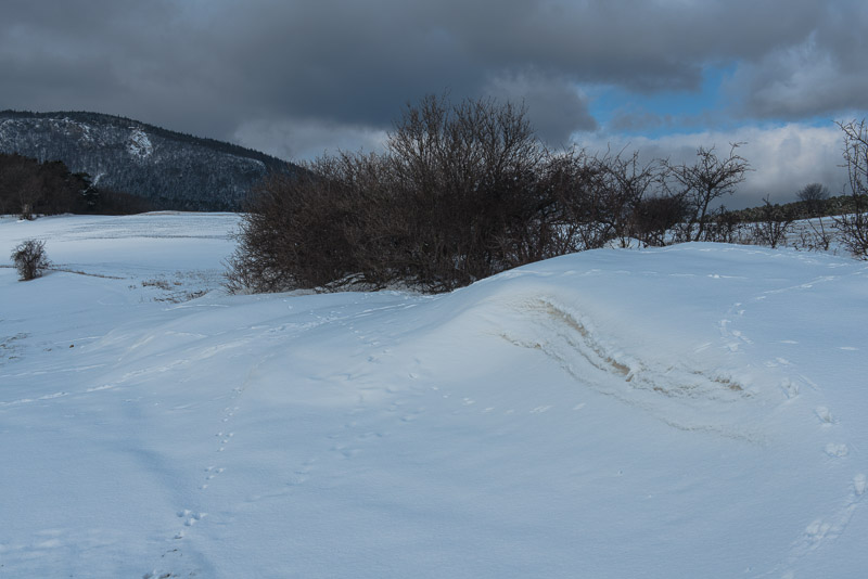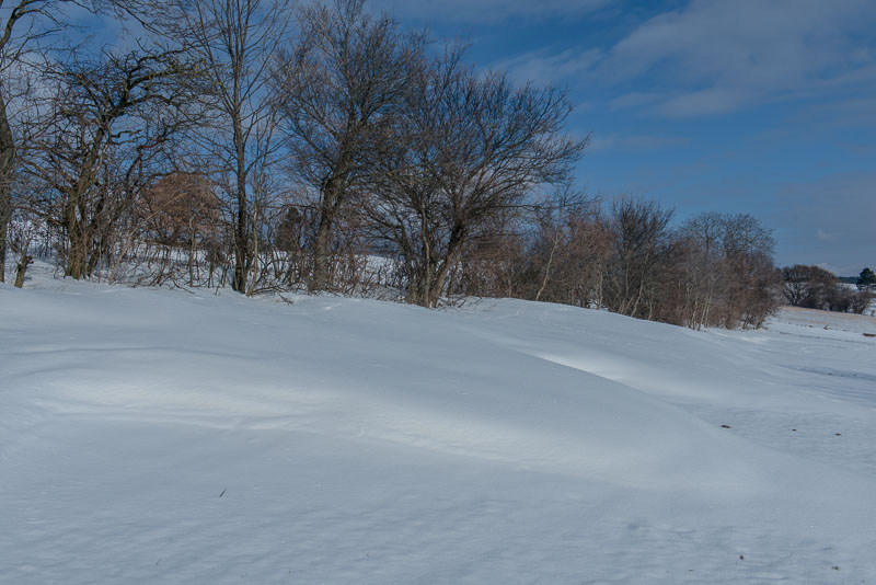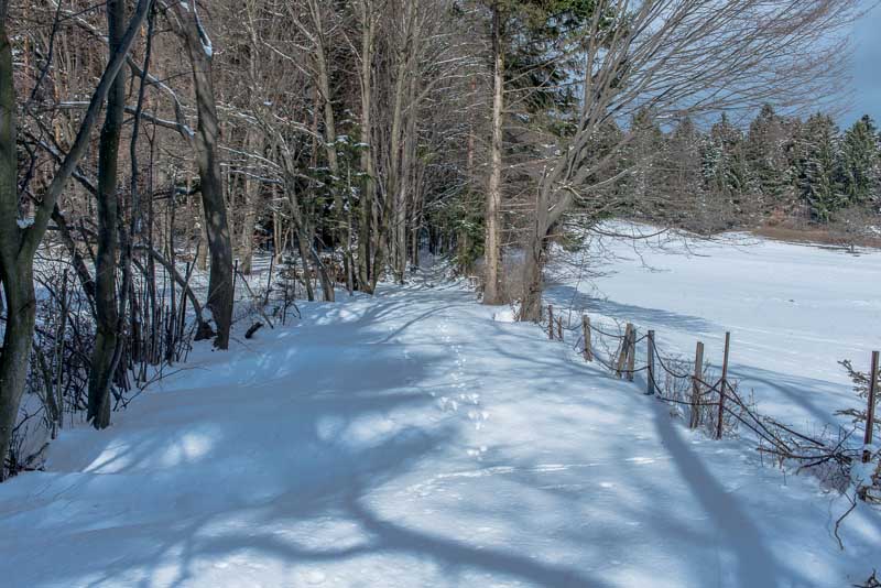Die Schneewechten sind hoch unter den Baumzeilen, und so windgepresst und gefroren, dass man gut darüber gehen kann. Nur seichte Spuren in dem wenigen frischen Schnee.