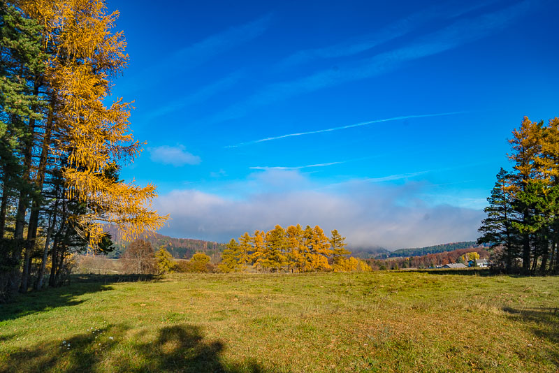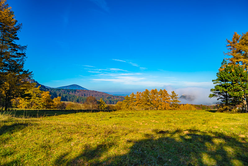 On the meadow above the Frankenhof. View over the mist to the Wechsel massive.