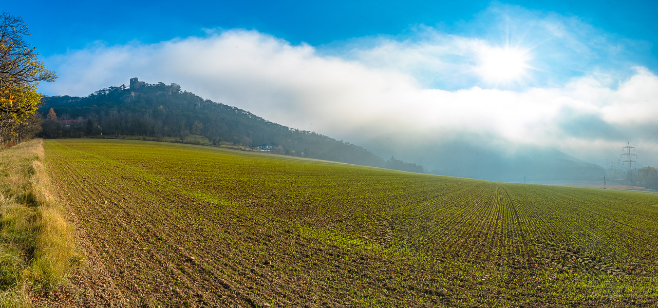 Panoramabild mit der Ruine Emmerberg ganz links.
