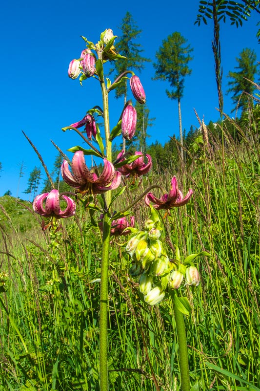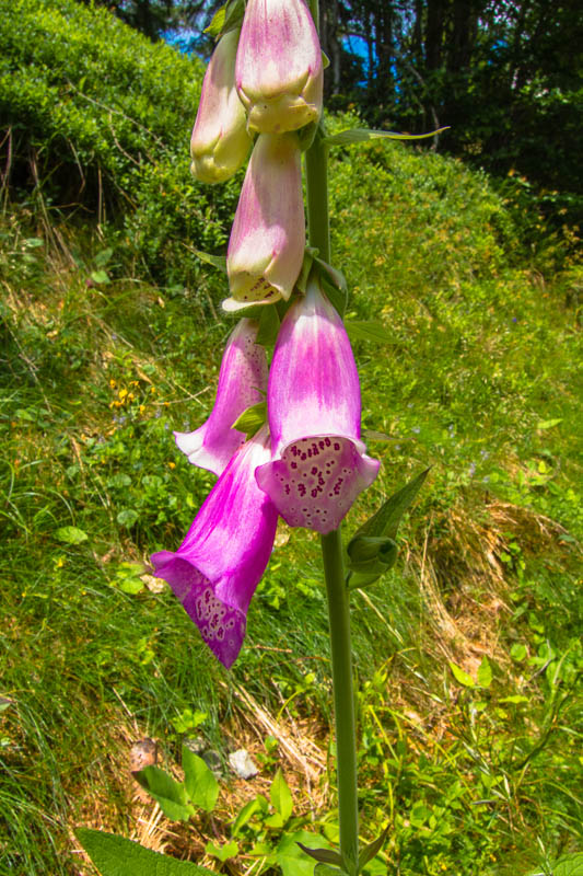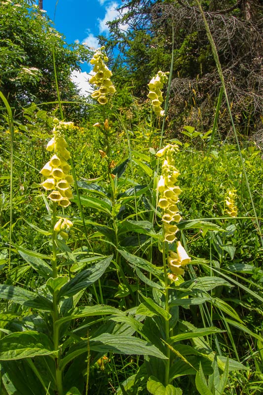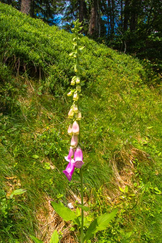 Nearly back at the saddle, we find a common floxglove (Digitalis purpurea). I read in Wikipedia, that this plant prefers areas devoid of limestone. So what? inmidst the limestone mountains? So I have a look at the Wikipedia page of the Trenchtling, and it says in the chapter "Geology", that the mountain mainly consists of limestone, but in close contact to the underneath "Werfen formation" (slate). And indeed, the rocks haver a more dark, greyish colour here.