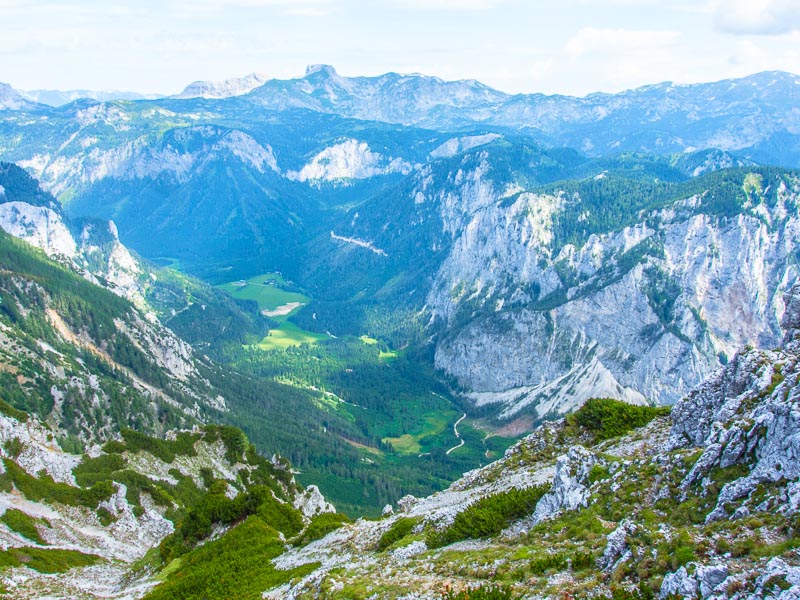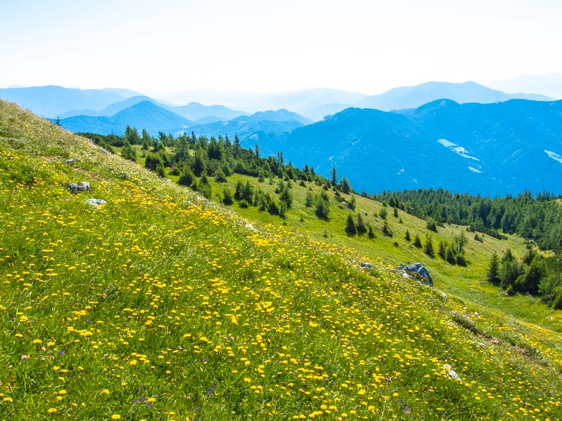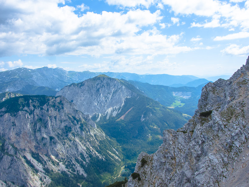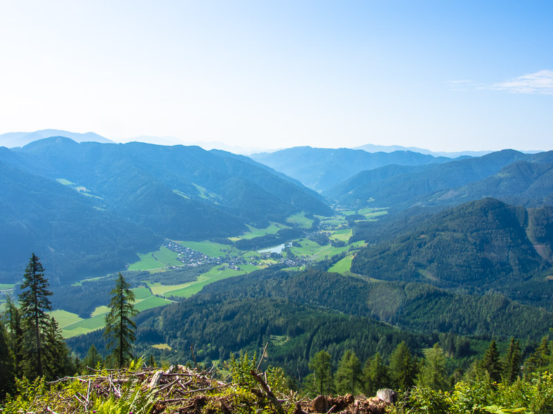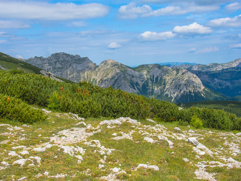 We walk a bit more up and fidn this place with excellent view down and over to the valley around Tragöß and to the main summit of the Hochschwab.