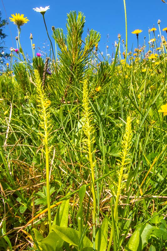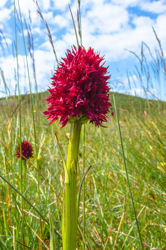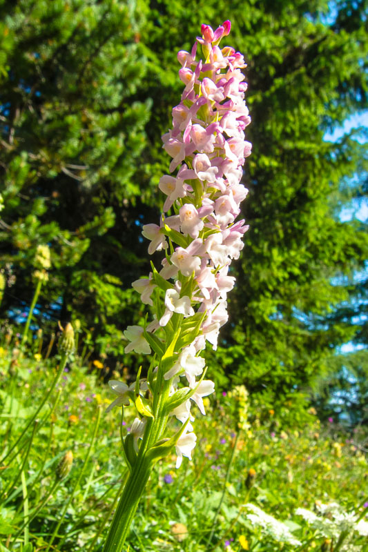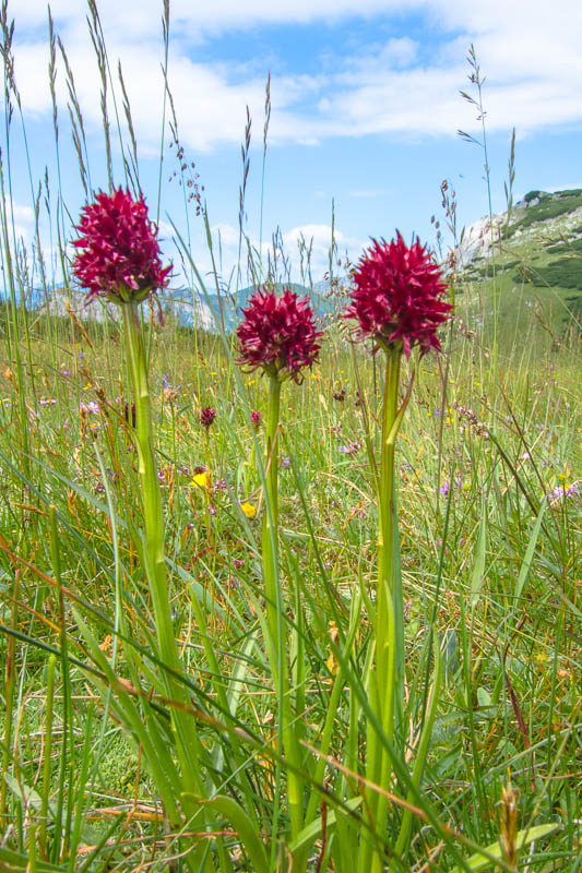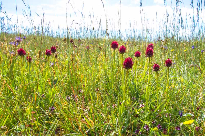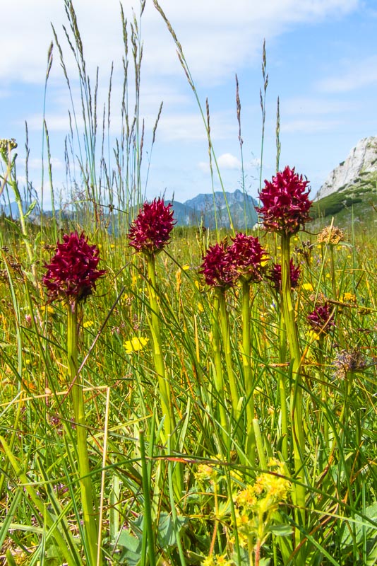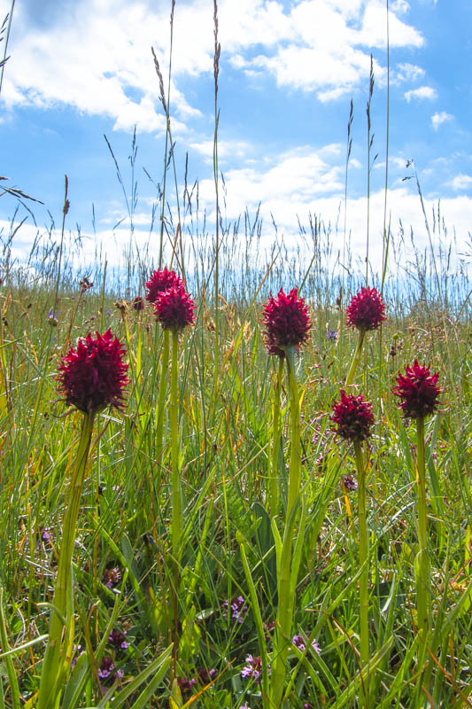 Whereas Edelweiß covers the very scraggy places between the slope and the plateau, on the plain grassland of the plateau thousands of Black Vanilla orchids (Nigritella rhellicani)