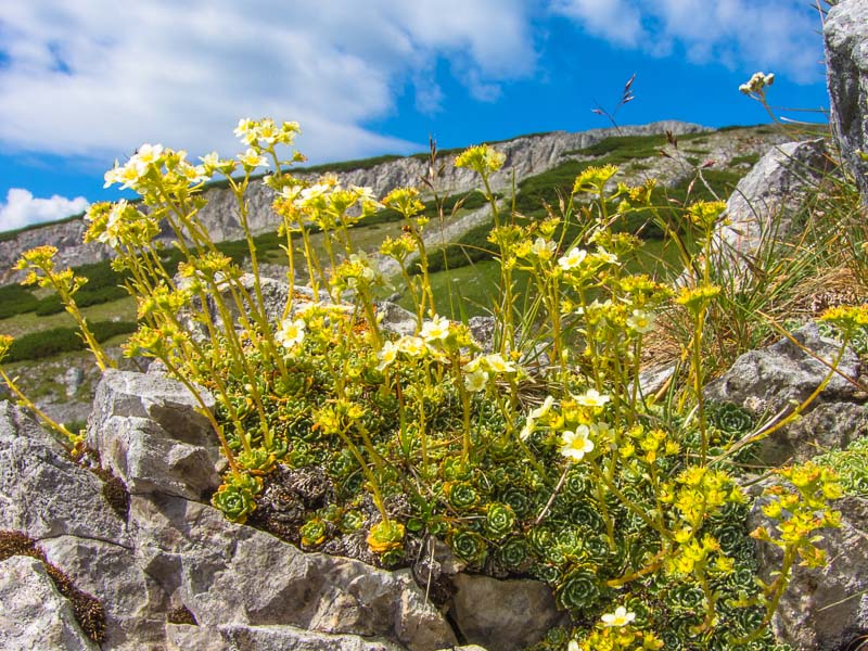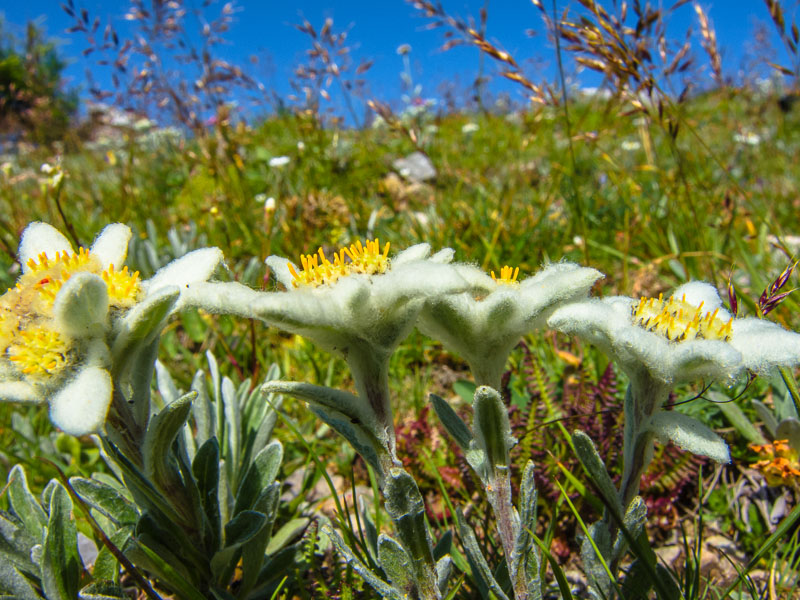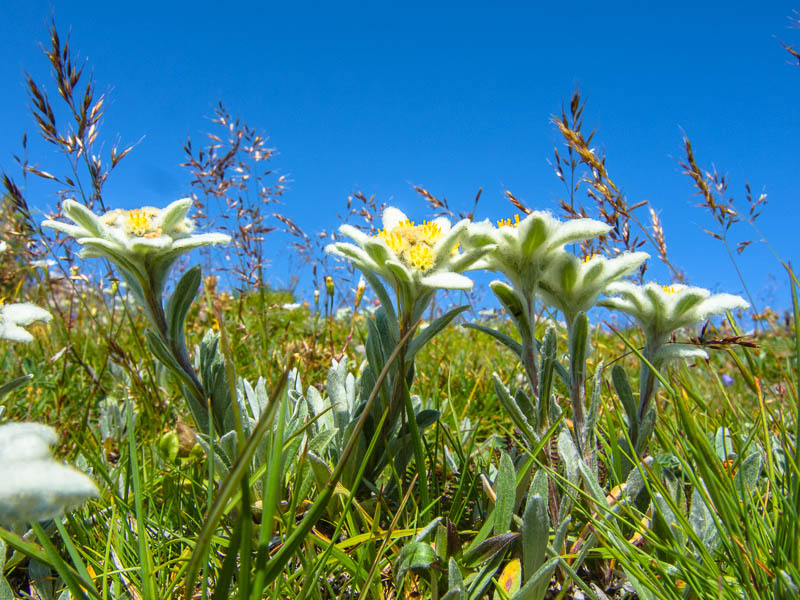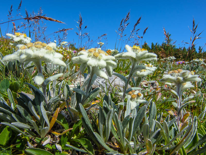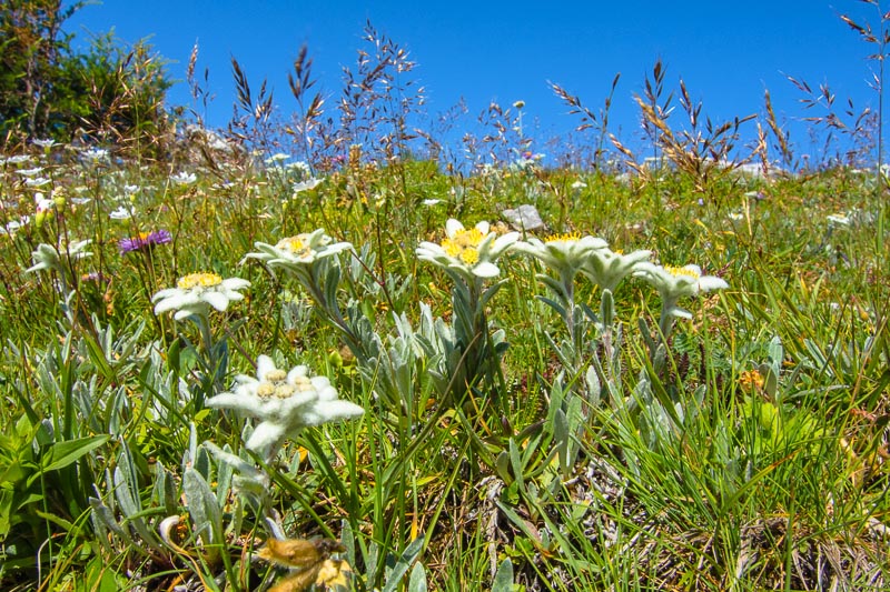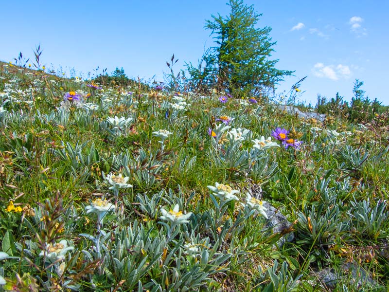 And then, all of a sudden, the landscape changes when we leave the steep slope to enter the plateau. Here thousands of Alpine Edelweiß (Leontopodium nivale) are growng, so many that you have to take care not to step on one.