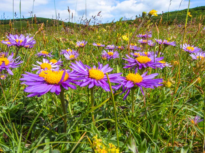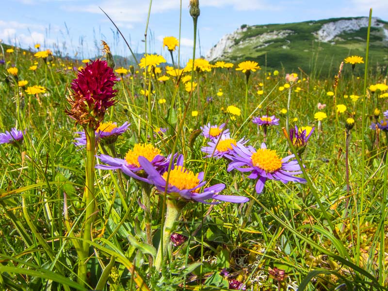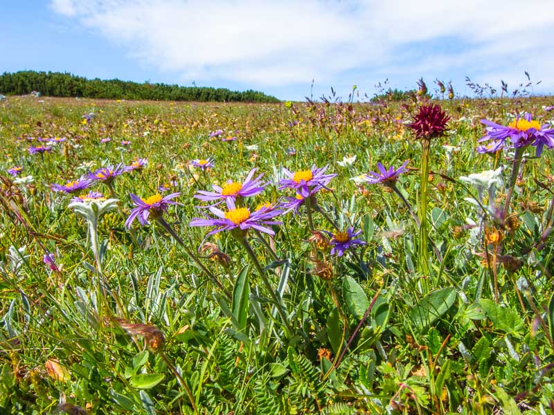 ... as well as Alpine Aster (Aster alpinus) and Black Vanilla orchids, here together with some Edelweiß.
