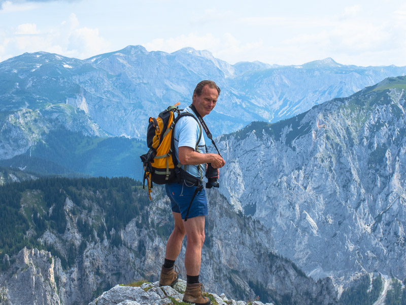 We discuss a bit about the question, which mountains can be seen, and my opinion that the summit exactly behind Herwig is the main summit of Hochschwab.