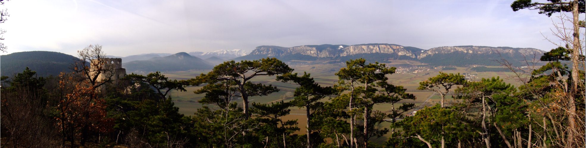 Panoramablick vom Schloßberg mit der Ruine Emmerberg. Ganz links der Mitterberg, rechts hinter der Burg der Kienberg, dann Schneeberg und Hohe Wand.